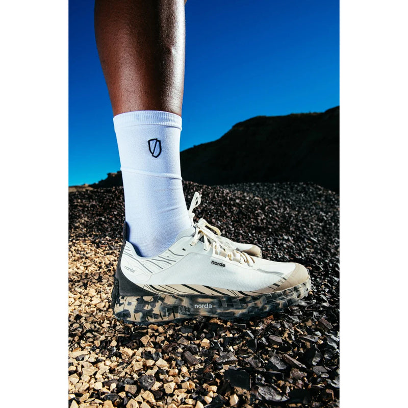 The soleplate design is inspired by the rock formation of the Canadian Shield. Vibram® Litebase® technology reduces overall sole weight by 30%, conserving energy and enhancing performance across long efforts. Vibram® Mega Grip® rubber delivers superior durability, traction, and the strongest grip on both wet and dry surfaces. The norda™ Lock System uses an ultra-light sock gusset construction to eliminate tongue slippage and enhance fit.