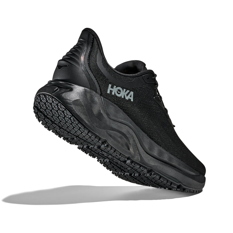 HOKA Arahi SR men's slip-resistant work shoes in Black - outer view showing enhanced H-Frame™ stability and breathable textile upper