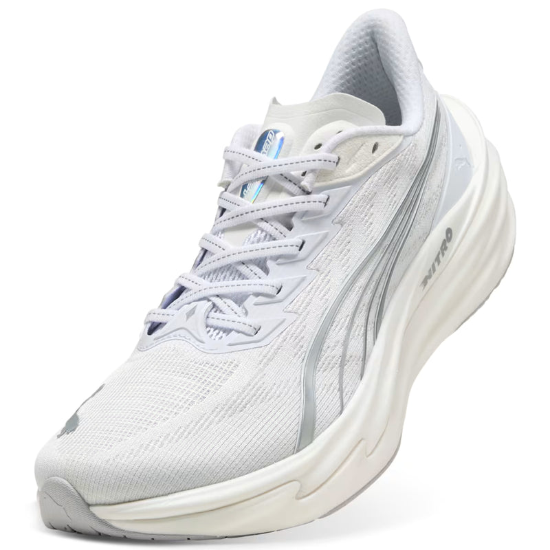 The breathable engineered mesh upper keeps weight minimal whilst providing secure containment during high-speed running. PUMAGRIP outsole uses durable rubber compound for multi-surface traction, maintaining grip on roads, tracks, and varied surfaces. At 15g lighter than the Deviate 3, every detail prioritises speed without sacrificing the maximal cushioning neutral runners need. The upper incorporates at least 20% recycled materials, combining performance with environmental consideration.