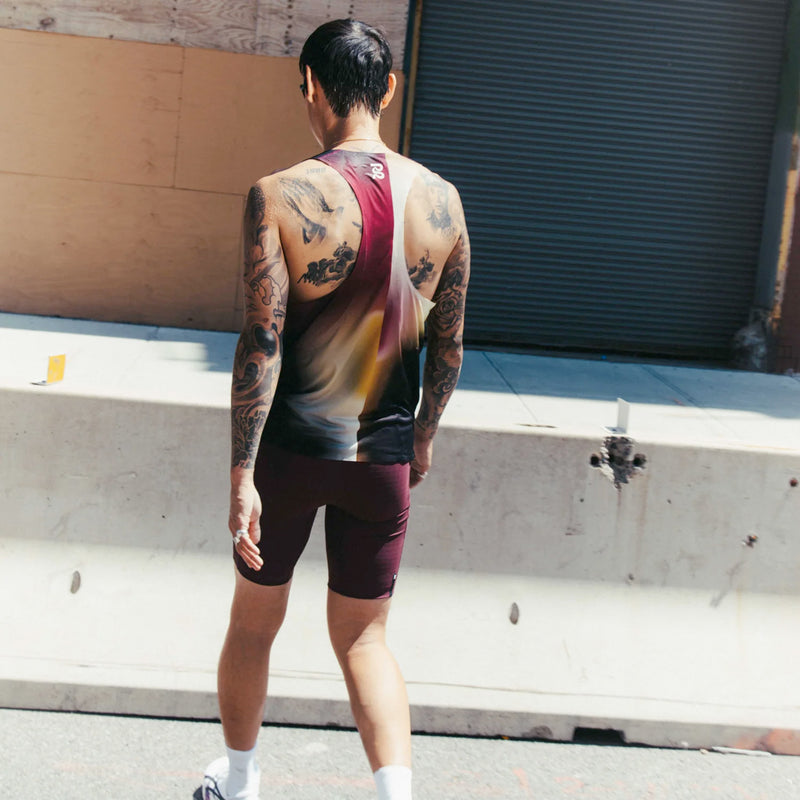 Our Drift™ Racing singlet, now in our limited edition seasonal gradient print. Details include narrow straps and racerback for unrestricted range of motion, bonded seams to prevent chafing, side slits for additional mobility, and piecing creating a sleek look. Complete with reflective graphic hits at center front, right hem for visibility. Featherweight and airy, Drift™ employs a sophisticated jacquard knit construction creating a micro-textured surface on its reverse side, strategically designed to reduce sticking. The Drift™ singlet keeps you chafe-free and cool. The ultimate racing item, engineered to seamlessly move with your body.