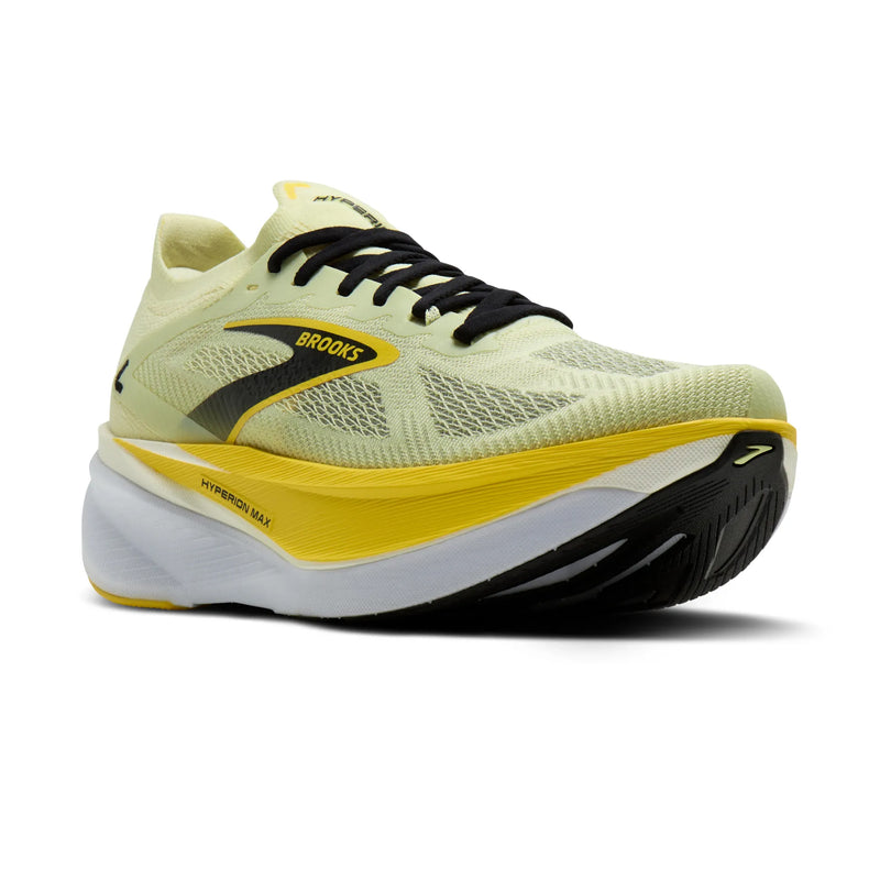 Brooks Men's Hyperion Max 3 Running Shoes Luminary Cyber Yellow Black outer side view showing high-stack DNA FLASH v2 cushioning