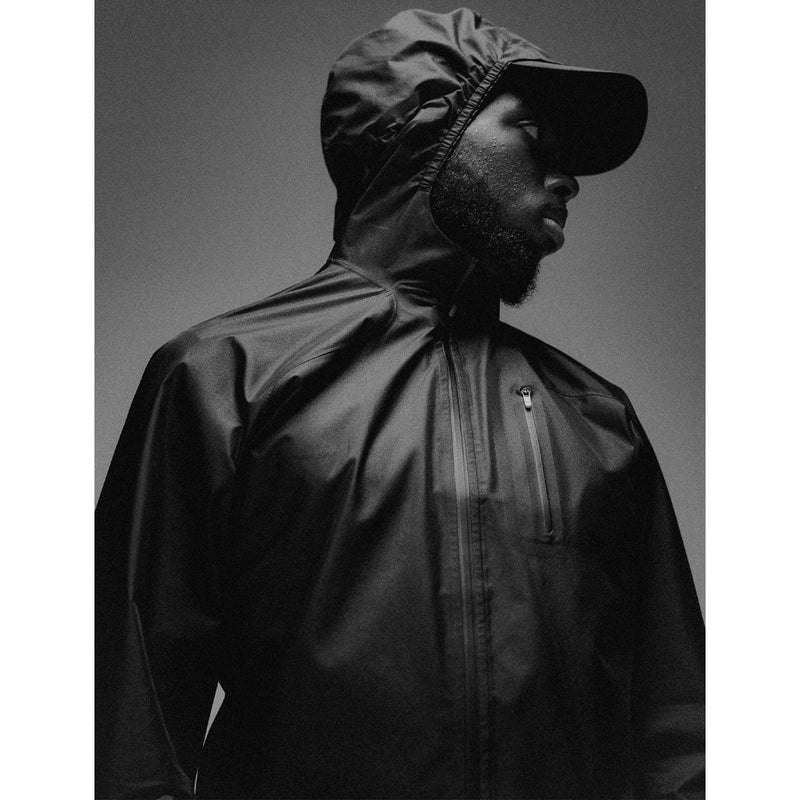 A sculpted fit, bonded collar stand, and single-point hood adjustment keep the profile clean, whether worn or stowed. The collar holds structure when the hood is down, while the hood locks in with a snap tab when the pace picks up. Fully-taped seams, a dropped rear hem, and black-on-black finishing complete the silhouette.