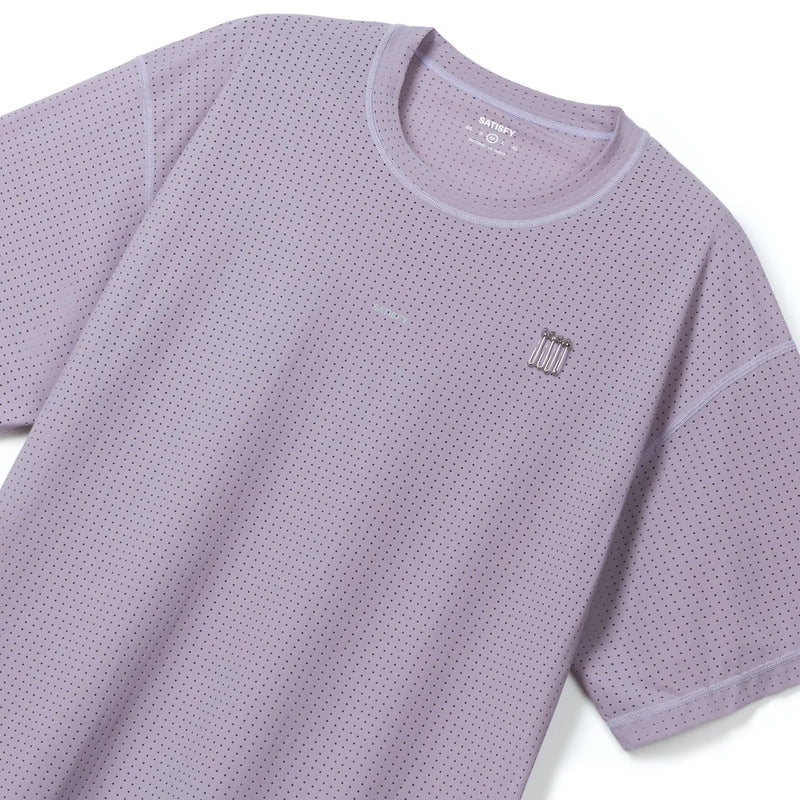 Satisfy Space-O Tee Dusk front product view showing 120-gram Space-O Italian micro jersey with precision punched openings and reflective SATISFY print